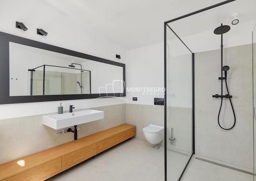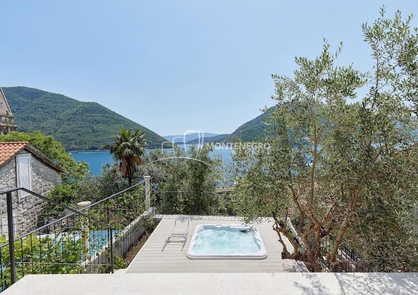 В купели дома есть прекрасная терраса, укомплектованная роскошным джакузи, с которой открывается захватывающий дух вид на острова Пераст и море.